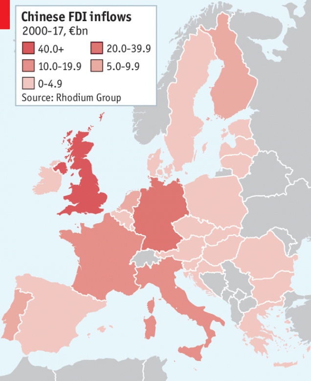 “Kineska ulaganja u Europsku uniju u 2016. godini su porasla na gotovo 36 milijardi eura, dok su 2015. iznosila 20 milijardi eura, prenosi američka istraživačka tvrtka Rhodium Group. Mnoga od njih podupire država, što govori o ambicijama Komunističke partije Kine da Europu zadrži kao pomoć kineskom gospodarskom rastu. Sve do ove godine, koja je bila rekordna, najviše u Njemačkoj, kineske investicije su političari zemalja EU uglavnom pozdravljali bez previše razmišljanja. Ali veliki priliv novca je potaknuo čelnike u Berlinu, Bruxellesu i drugdje da počnu brinuti zbog moći i utjecaja Kine na procese, posebice u manjim zemljama EU. Od tada su pooštrili projekcije kineskog ulaganja i pokušava se stvoriti zajednički europski odgovor. Ali ti napori jedva prate stopu ulaza kineske gotovine. Inozemna ulaganja su 2017. s 40 milijardi pala na 30 milijardi eura, što odražava globalno usporavanje kineskih izravnih stranih ulaganja. Ipak, u Europi udio povećan s petine do četvrtine”, žali se The Economist, koji u ovom dijelu navodi kako kineska ulaganja u EU “pomažu Komunističkoj partiji Kine”, ne kineskoj ekonomiji ili narodima Kine općenito, da se lakše nose s negativnim učincima trgovinskog rata sa Sjedinjenim Državama.