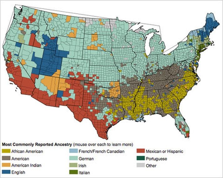 Međutim, ono što je važno je da SAD više nisu etnički homogena zemlja kao u vrijeme Tocquevilla, nego je to multietnička zemlja, ali ne i ravnomjerno multietnička. Ova karta pokazuje dominantne etničke skupine u svakom dijelu zemlje.